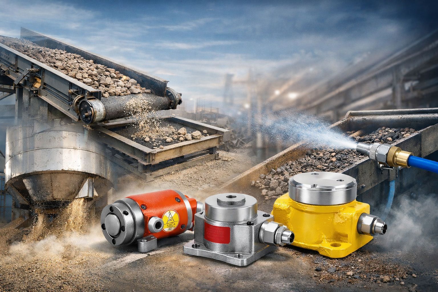 Pneumatic rotary vibrators are used to maintain bulk material flow by preventing blockages, bridging, and adhesion in hoppers, silos, chutes, and conveyors.